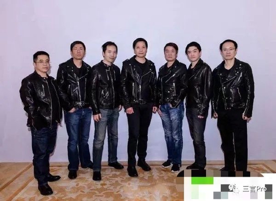 再来一个“大招”,2017年小米公司年会上,雷军与其他几位高管身穿皮夹克合影。图中分别是黎万强、刘德、洪锋、雷军、王川、黄江吉和林斌。